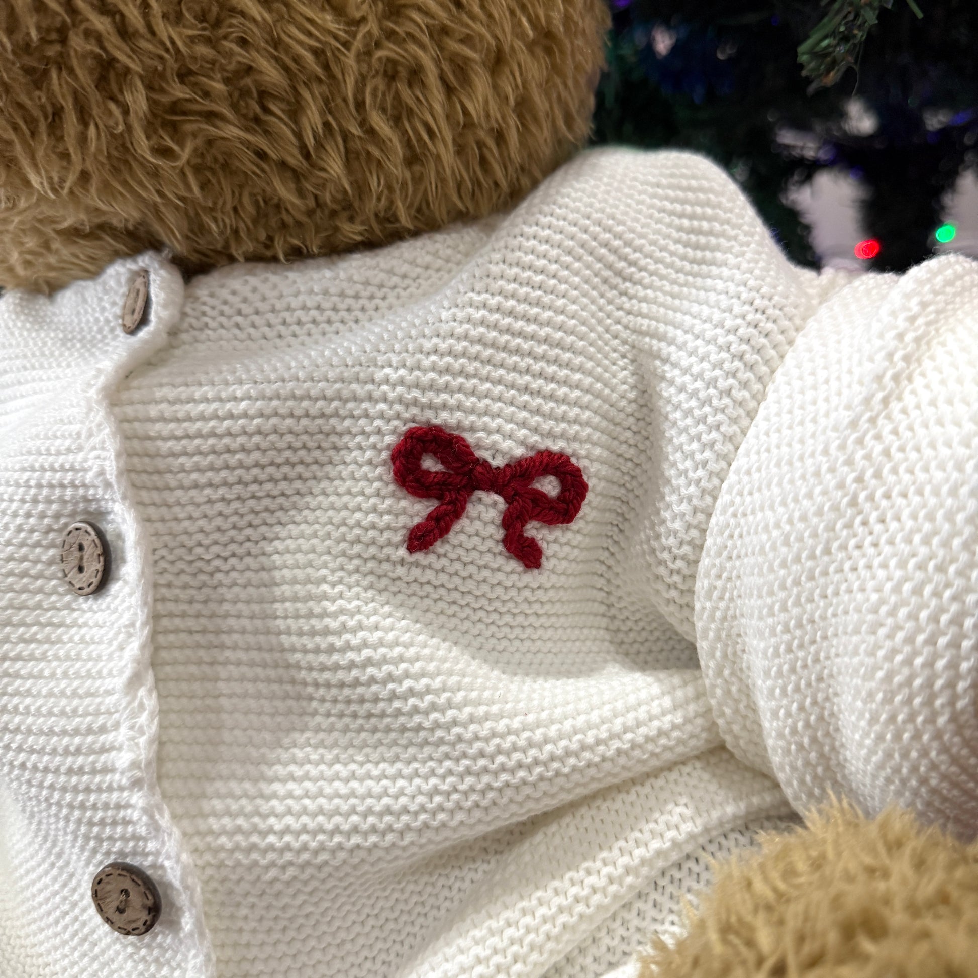 White Scalloped Knit Cardigan with Red Bow